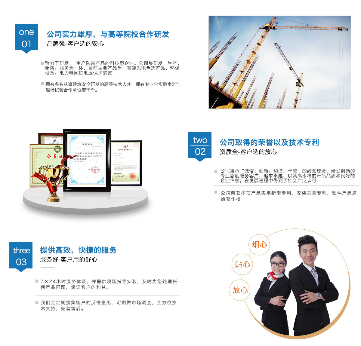 南京通和電氣科技有限公司是致力于研發(fā)、 生產(chǎn)防雷產(chǎn)品的科技型企業(yè)。公司集研發(fā)、生產(chǎn)、銷售、服務(wù)為一體,目前主要產(chǎn)品為:智能光電色選產(chǎn)品、環(huán)保設(shè)備、電力電網(wǎng)過(guò)電壓保護(hù)裝置。電力成套設(shè)備。光電產(chǎn)品、電力監(jiān)測(cè)設(shè)備等。公司秉承“誠(chéng)信。創(chuàng)新、和諧。卓越”的經(jīng)營(yíng)理念,研發(fā)創(chuàng)新的專業(yè)態(tài)度服務(wù)客戶,追求卓越,以其高水準(zhǔn)的產(chǎn)品品質(zhì)和良好的企業(yè)信譽(yù),在發(fā)展進(jìn)程中得到了社會(huì)廣泛認(rèn)可。